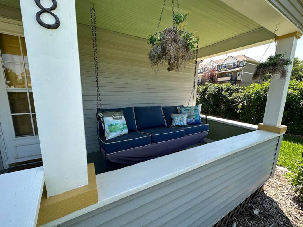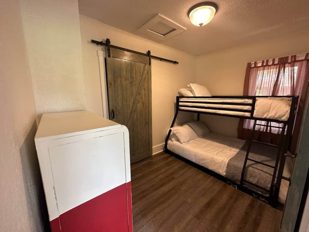The home sleeps five, with a queen bed in one bedroom and a twin-over-full bunk in the other. A full kitchen gives you the option to cook at home, and the fenced backyard makes it easy to bring your dog along. Out front, unwind with a cup of coffee on the porch swing and take in the neighborhood charm.