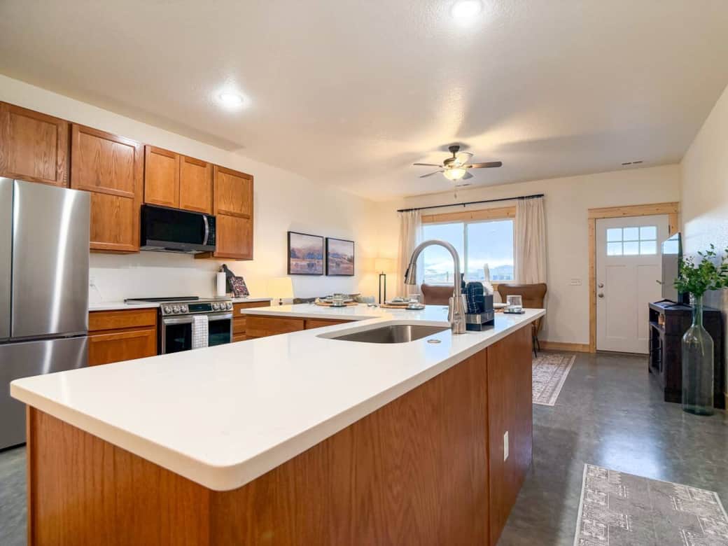 The open-concept living area is the heart of the home. Cook a full meal in the modern kitchen featuring gleaming quartz countertops, stainless steel appliances, and a drip coffee maker stocked with local coffee to start your day right. Kick back on the sofa to watch the clouds roll over the Big Horns, stream your favorite movies on the Smart TV in the living room, or unplug with the family games we’ve provided.